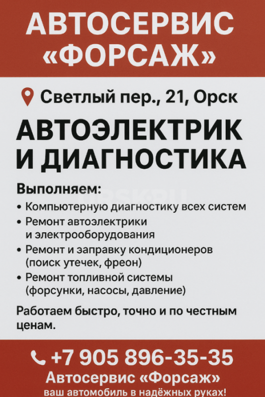 Автосервис «Форсаж» — автоэлектрик и диагностика Светлый пер., 21, Орск Выполняем: • Компьютерну