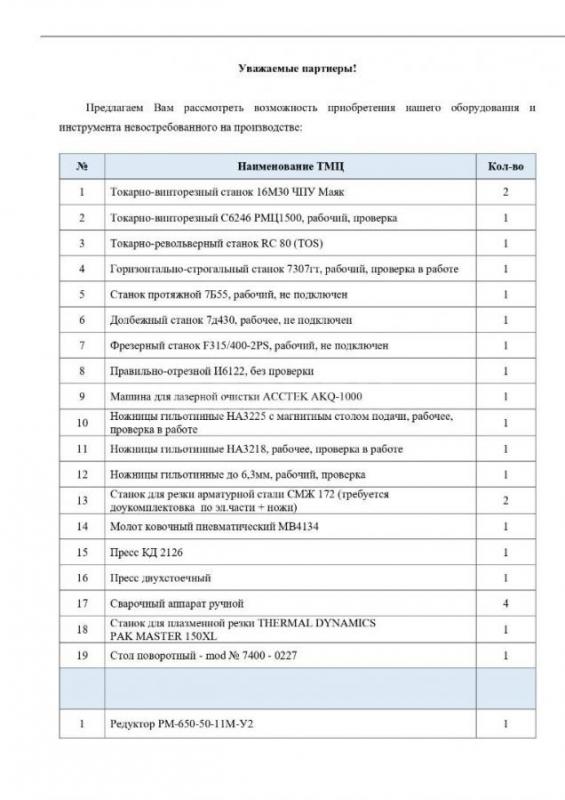 ООО "РМЗ" реализует невостребованное оборудование и ТМЦ.