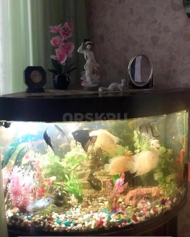 Угловой аквариум с тумбочкой, объем 160 литров, с крупными рыбками (11 штук), компрессором для возду