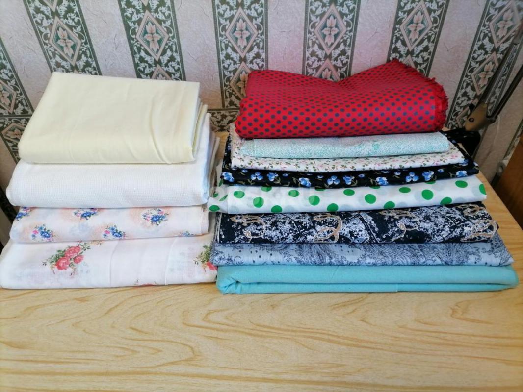 Ткани разные: х/б - ситец, сатин, фланель, полотенечная вафельная, наперник, шёлк, трикотаж чёрный,